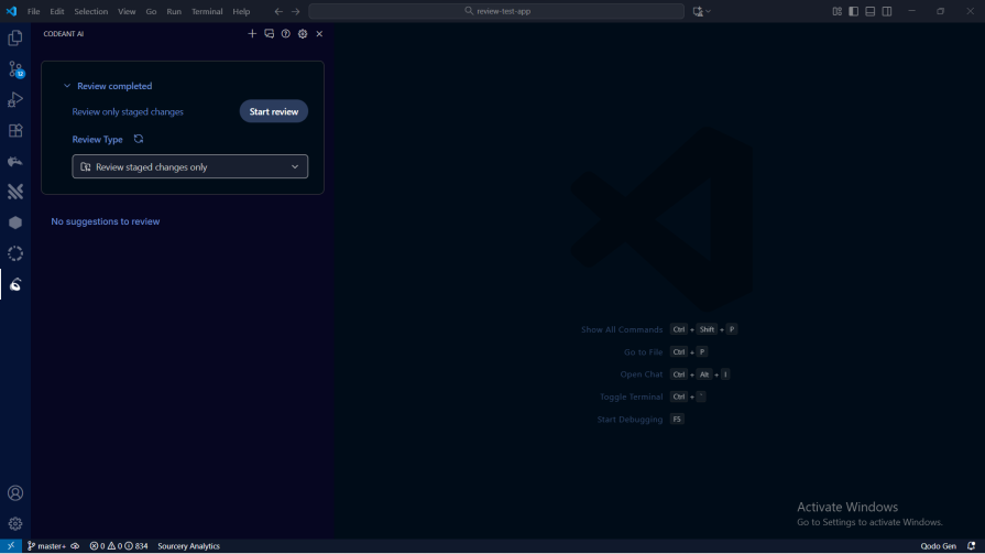 Setup works the same as the other tools – install the extension, log in with your CodeAnt AI account, and you’re ready to start a review: