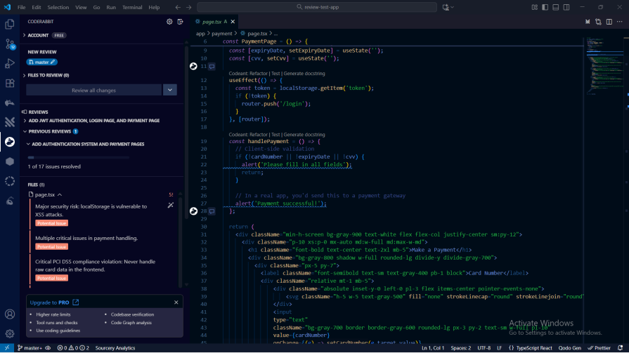 CodeRabbit is built specifically for code review. Unlike the prompt-driven tools, you don’t ask targeted questions. You just run it on your codebase, let it generate a review, and then go through the issues. For smaller items, you can even let CodeRabbit auto-fix them for you: