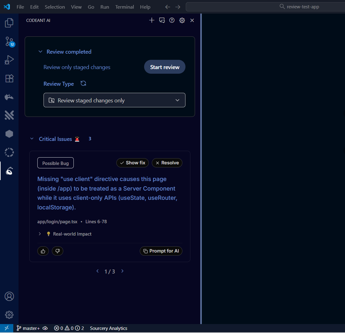 CodeAnt AI is simple to get running – install the extension, sign in, and you can launch a review right away. It works similarly to CodeRabbit: open the codebase you want to analyze, hit “Start review,” and let it run.