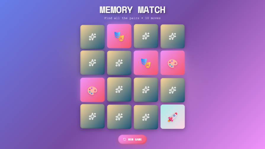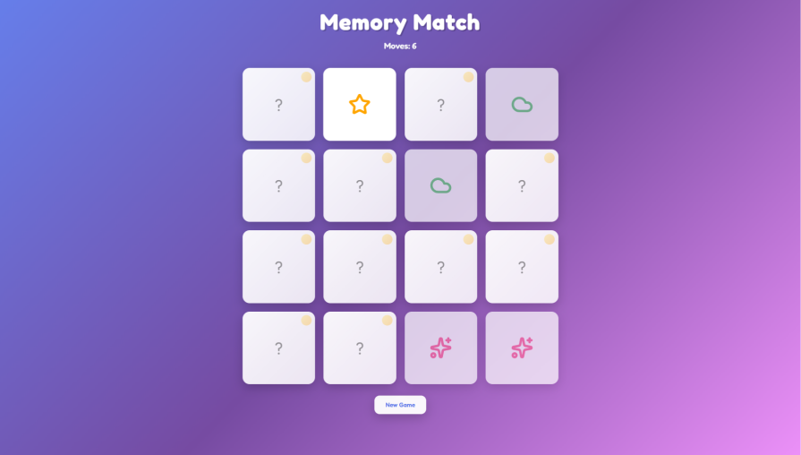 | Functionality | Card matching, flip animations, move counter, win detection, reset | Card matching, flip animations, move counter, win detection, reset | Card matching, flip animations, move counter, win detection, reset |