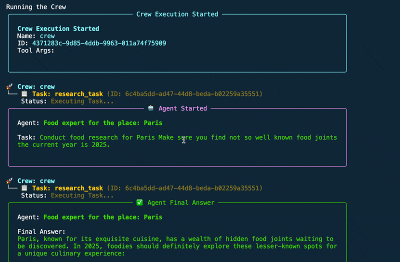Open the agents.yaml file and the tasks.yaml file and provide the details for the two agents. You can find the details in this GitHub repository. Once the agents.yaml and tasks.yaml files are ready, we can now make the code changes in the crew.py file and the main.py file to run the crew by supplying a place. For this example, we supply “Paris”. Then, we run the crew with the command: