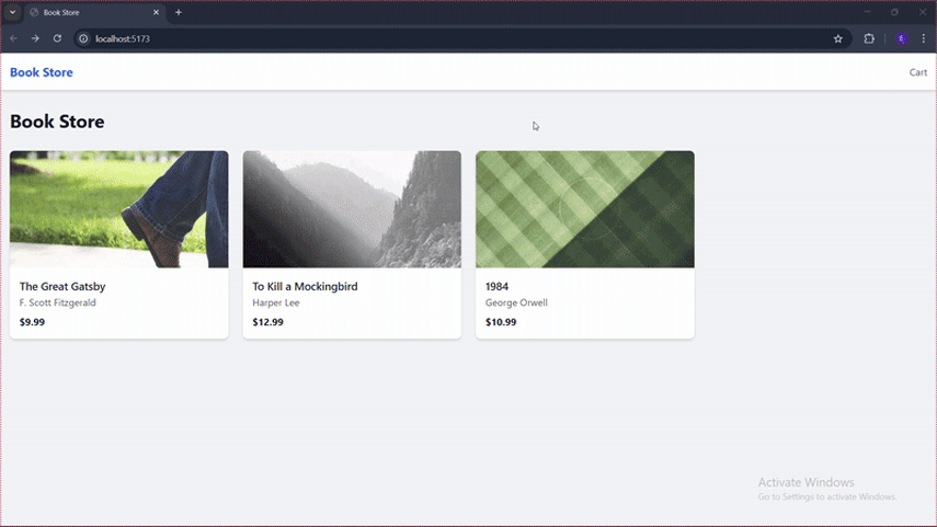 /specify I want to build the front end for a bookstore. The application should have three main pages: a product listing page, a product detail page, and a shopping cart page. The Product Listing Page will display a grid of books fetched from a mock API. Each book in the grid should show its cover image, title, author, and price. When a user clicks on a book from the listing page, they should be navigated to a Product Detail Page for that book. This page will show a larger image of the book cover, the title,author, a longer description, and an Add to Cart button. The Shopping Cart Page will display all the books that have been added to the cart. For each item in the cart, it should show the book's title, price, and quantity. The user should be able to change the quantity of each book and see the total price of the cart update automatically. There should also be a Remove from Cart button for each item.