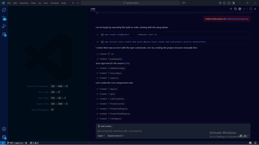 It returned a few recommendations, but since they weren’t critical for this demo project, I decided to move ahead and run the /implement command.