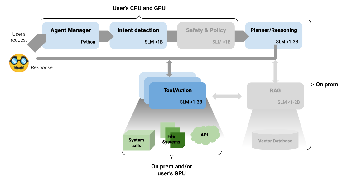 Note: For simplicity, the current implementation does not include Safety and Policy filtering, as the intended model (deberta-v3-small) is not available in a format compatible with Ollama. Another greyed-out component is the RAG. We have no additional source of information (e.g., documents, databases, etc.), so we don’t need to set up a RAG component here. You can compare this image with the more general version from the previous article.