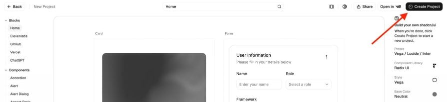 Choose your colors, spacing, fonts, and icons upfront, and Shadcn Create generates a project with those preferences already configured in your theme. It’s a faster, more intentional way to build something that feels unique from line one.