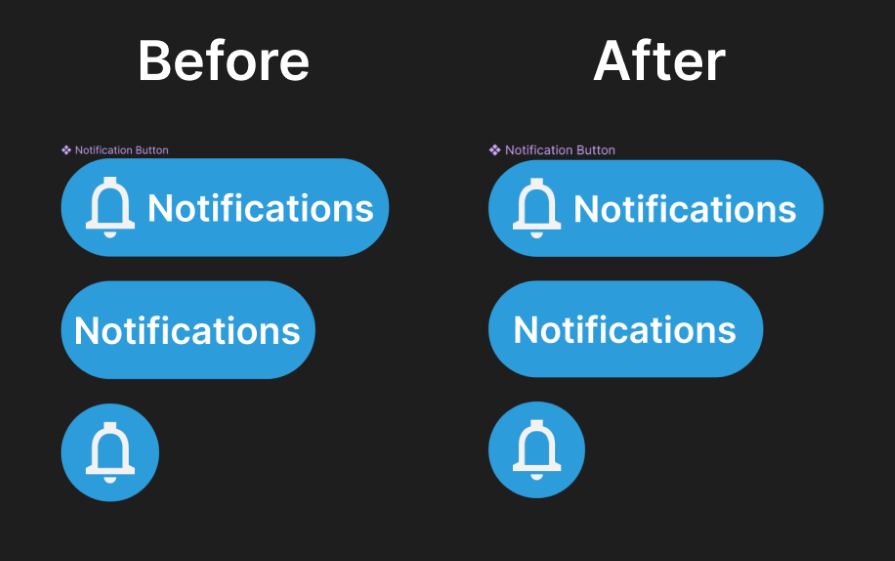 You may have noticed that in that last example, the resulting button variants don’t actually look that great. Because the Boolean properties simply show or hide the layer and otherwise maintain the auto layout properties, you might find yourself with less control over the padding that’s left after you remove each piece.