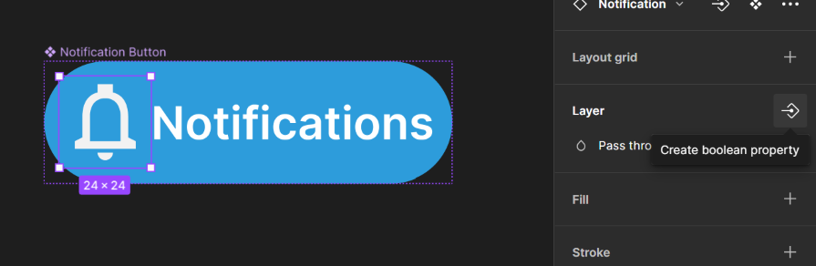 To create a Boolean property, select the layer that will be hidden in some variants, and then in the Layer panel, select Create boolean property. You will be asked to name the property (it will default to Show Icon if the selected layer is named “Icon”).
