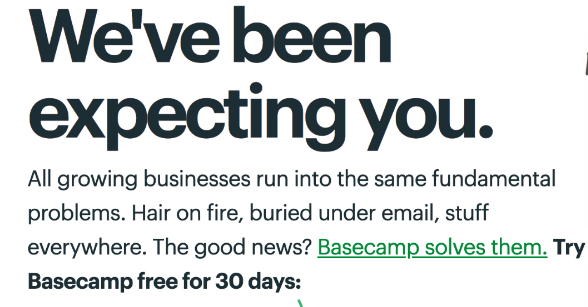 “We’ve been expecting you” grabs most of the attention, but it tells me nothing. The problems listed are unclear (what does “hair on fire” mean, really?), so I don’t really know what “Basecamp solved them” means. I can’t even figure out what Basecamp is.