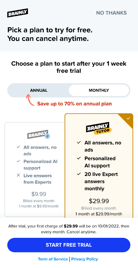 Let’s take an example of our approach when designing the checkout experience at Brainly. When you land in our purchase funnel, you first see a checkout with a minimal amount of information and an already preselected plan. If you are a system 1 thinker, you just need to click a button: