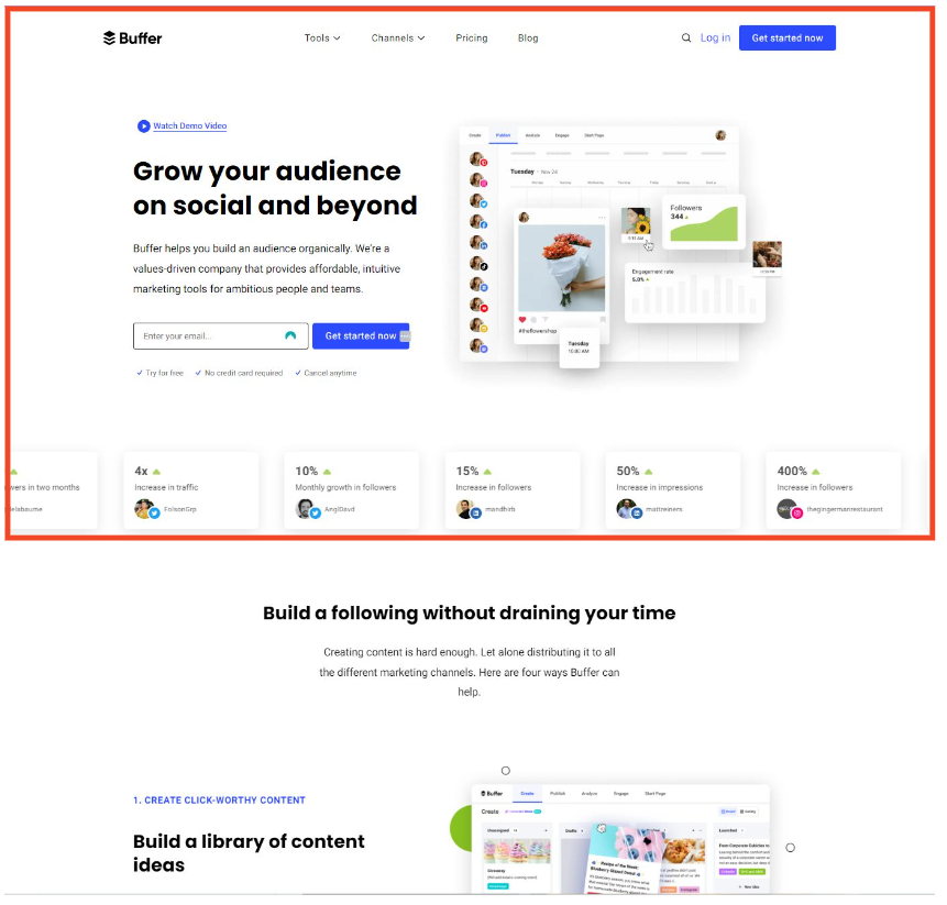 For example, although Buffer has quite a robust landing page, the hero section (in red) already: