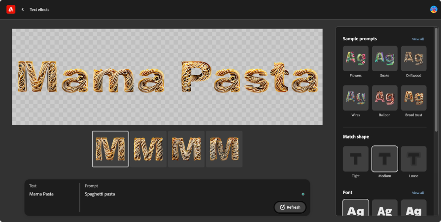To achieve text effects, I obviously used the Text Effect feature. With that feature, you can add text on one side and style on the other. When I started, I asked the AI to generate the text based on this prompt: "Mama Pasta" with the style "Text from pasta."