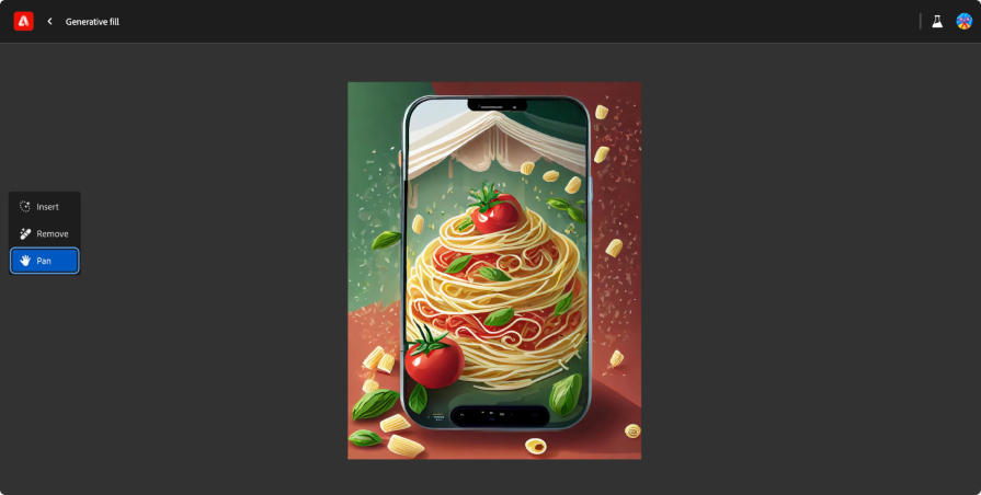 I got images of a mobile phone with an image of pasta. I was unhappy with the results, so I used the Generative Fill feature and edited a specific zone in the image to be more precise.