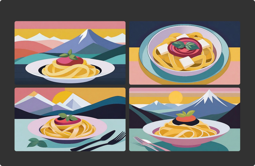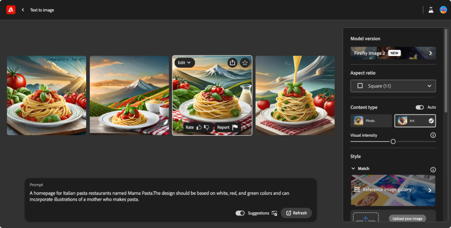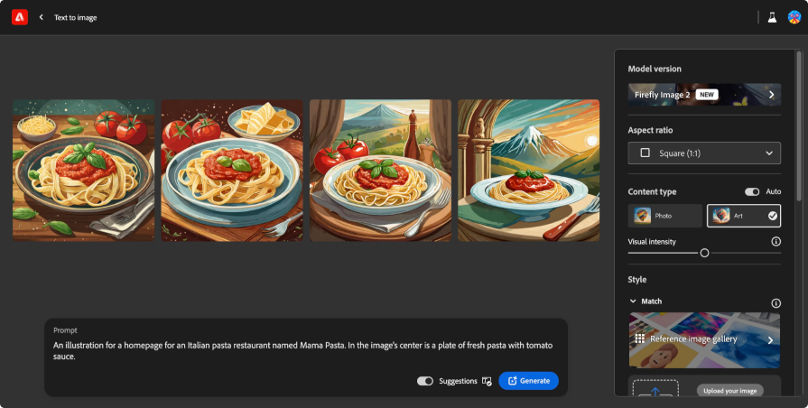 Here is the prompt I added to the text-to-image feature: An illustration for a homepage for an Italian pasta restaurant named Mama Pasta. In the image's center is a plate of fresh pasta with tomato sauce.