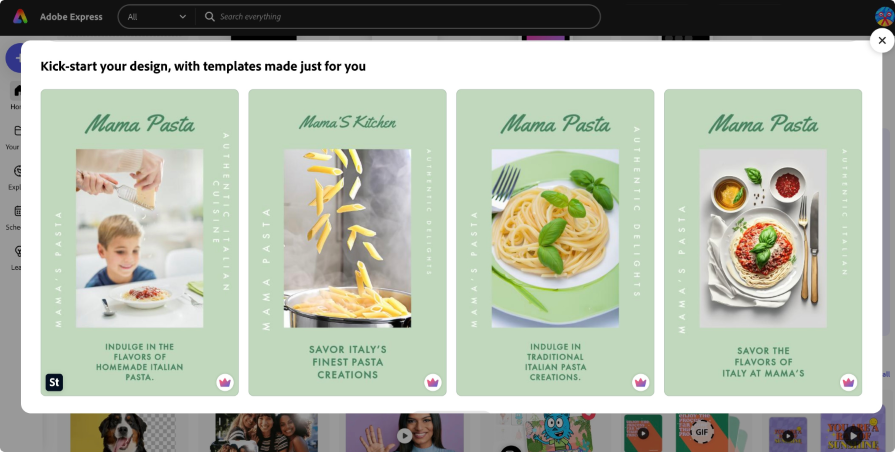 Adobe Express creates templates that are more than just images. I wanted to see if creating a homepage for an Italian restaurant is possible, so I used the same prompt as in the first test: A homepage for Italian pasta restaurants named Mama Pasta. The design should be based on white, red, and green colors and can incorporate illustrations of a mother who makes pasta.