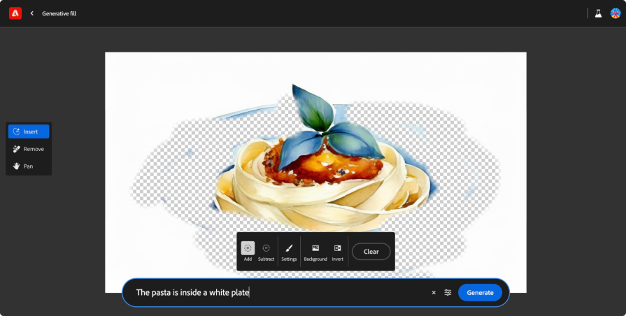The results were great, and I thought I wanted to have the plate in white, so I moved to the generative fill and tried it there. I selected one of the images and played with the generative fill feature.