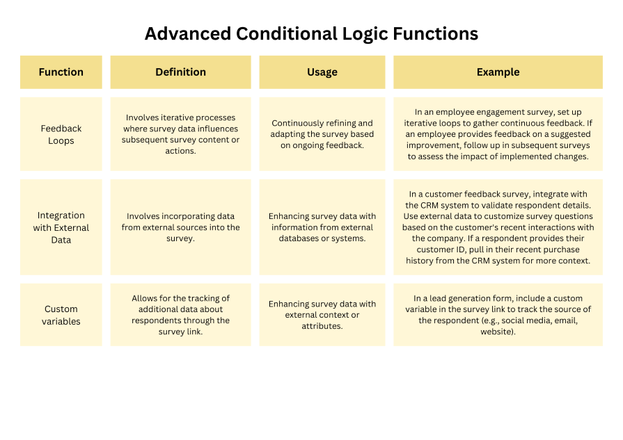 On the other hand, advanced conditional logic in survey design typically includes one or more of the following functions: