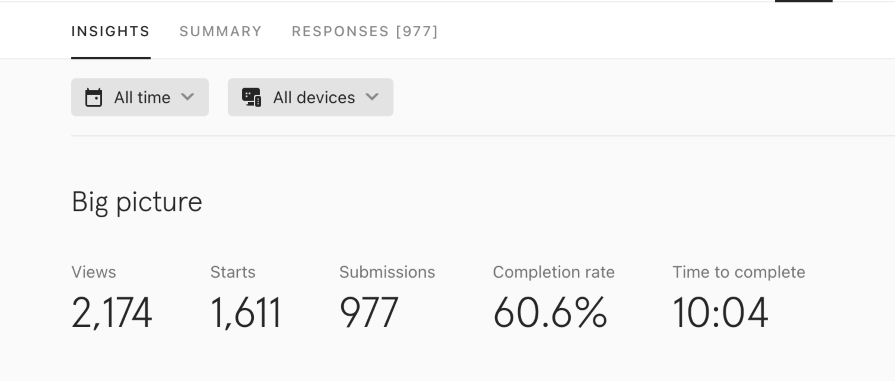 I have a personal preference for Typeform for its insightful survey metrics, providing data on views, starts, submissions, completion rate, and completion time. These metrics are crucial for iteratively enhancing your surveys and tracking the impact of these improvements in your survey design over time: