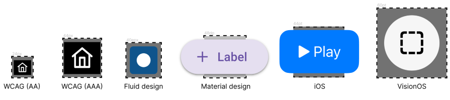 Apple is also the one giving the largest recommendations for its brand new visionOS to design for their VR headset: 60pt (80px). That’s because the spatial computing control is less precise than using a cursor or fingers, thus increasing the minimum wide of hit target is a necessity.