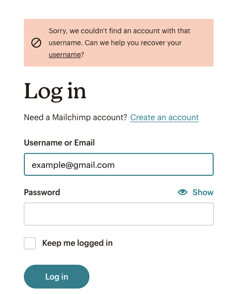 When you offer clear instructions to users, it helps them understand what occurred and correct their mistakes quickly to continue completing the task. When users are confused, they can’t focus because they think about the problem, and they may forget to complete the task. Look how Mailchimp uses clear instructions in their sign-in form suggesting a solution to the problem: