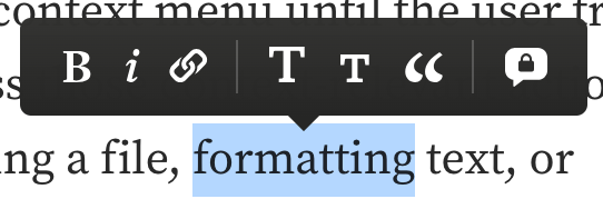 The action items are hidden within the context menu until the user triggers it, meaning that they would like to access those context-relevant actions. Some examples of actions include deleting a file, formatting text, or copying and pasting content. This allows apps to maintain a clean and simple interface while providing extensive functionality that is easy and quick to access: