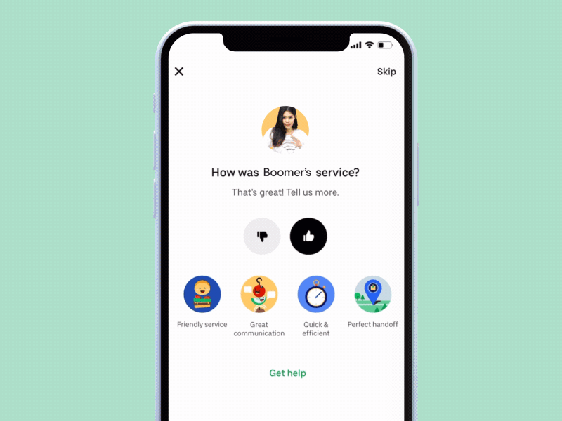 Icons can also be animated simply to add delight to an interface or help explain a process to the user. In this example from the UberEats app, each icon is animated to help communicate the type of compliment that the user can send to their courier. Not only are the animations engaging to look at, but they also help the user understand the context behind them: