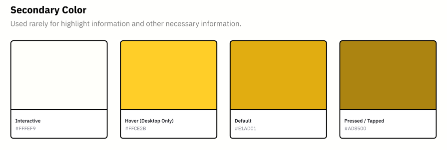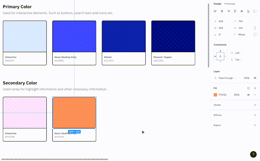 Based on this color, you will need to create a few essential states if your team hasn’t already: hover, pressed/tapped, and a lighter shade that can be used for other interactive elements such as search bars, toggle buttons, etc. Once you have those outlined, it will look something like this: