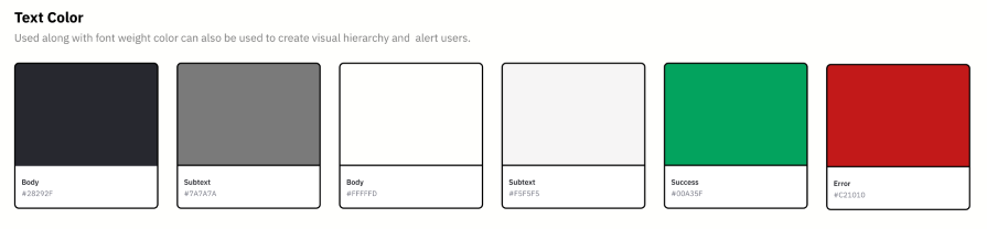 In this step, you will also consider the text colors. These will include your dark-mode text as well. As shown below, you will use a white body and white subtext on a black background. Text colors usually include your body text, any subtext, success colors, and error state colors: