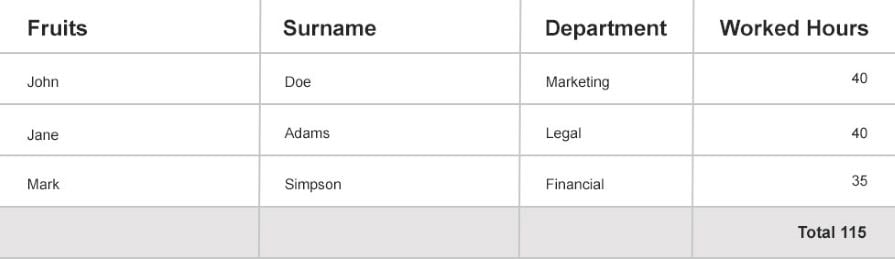 Repetition is a terrible practice. For example, if you have a list of employees and their working hours, you don’t need to repeat the word hours over and over again; just the header and the numbers below are enough: