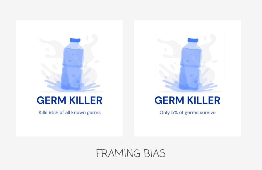 In the image above, notice how two ads for Germ Killer present the same information differently. The ad stating, “Kills 95% of all known germs” emphasizes the products’s effectiveness, while the ad “Only 5% of germs survive” draws attention to the remaining germs. This framing makes the 5 percent seem like a significant amount of germs left behind, potentially influencing how consumers perceive the product’s performance.