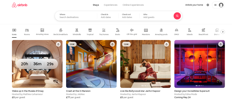 Airbnb’s homepage shows how careful design choices can lead to a visually attractive outcome. The clean and organized layout, consistent use of colors and styles, and high-quality images create an inviting appearance that motivates users to explore further.