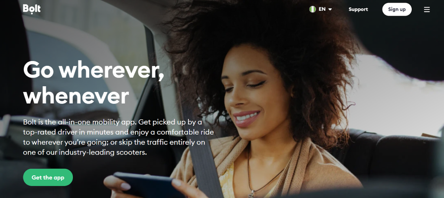 Bolt’s homepage immediately tells you who it is: an all-in-one mobility app. It also lets you know that it offers the convenience of being picked up by a top-rated driver in minutes, ensuring a comfortable ride to your destination. In addition, the prominent CTA “Get the app,” encourages immediate action.