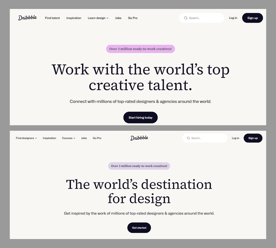 At its core, Dribbble is all about showcasing creative work and connecting designers to clients. However, its value proposition emphasizes these two aspects of its core function at different times, based on the users’ needs.
