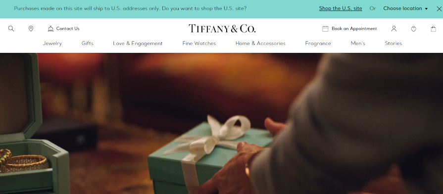 Upon landing on Tiffany & Co.’s homepage, you’re welcomed by the iconic Tiffany blue hue, a hallmark of the brand. The background image featuring the familiar Tiffany box further adds to the sense of luxury and elegance that defines the brand.