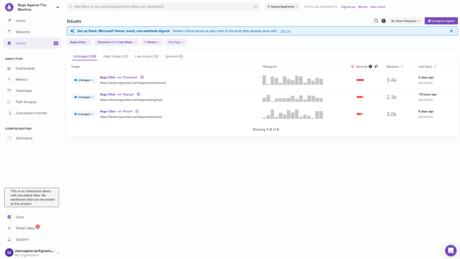 This visual feedback is instant and frequently highlights areas with potential for rapid improvement. With LogRocket specifically, not only can you identify patterns in terms of rage clicks, but you can also prioritize which rage clicks to address first based on the severity or page they occur on: