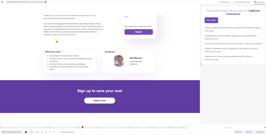 Session replay tools allow you to visually recreate the user’s journey on a website, offering insights into their interactions. When analyzing these replays, rage click patterns become apparent, usually in the form of rapid and repetitive clicks on particular web elements.