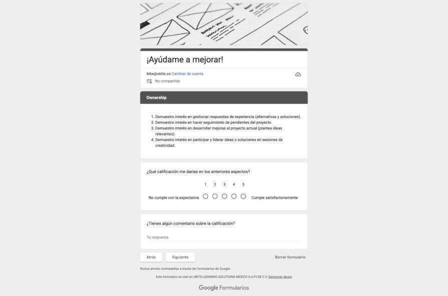 After a team meeting, we agreed that gossip comments were unhealthy; instead, constructive feedback would help us improve effectively. So, we decided to use the most basic UX tool: A form. A simple form with the right message after finishing a project will create a secure place to give feedback to all teams, avoiding irregular messaging from anyone.