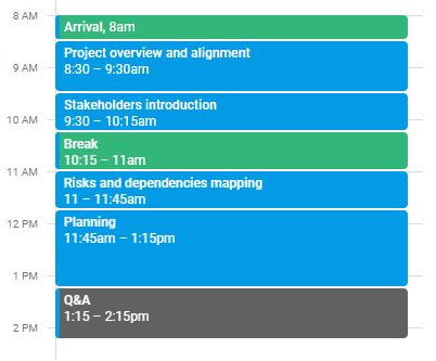 Whether it’s sharing details, discussing a plan of action, or ideating initial directions to pursue, make sure all your kickoff blocks are slightly too short.