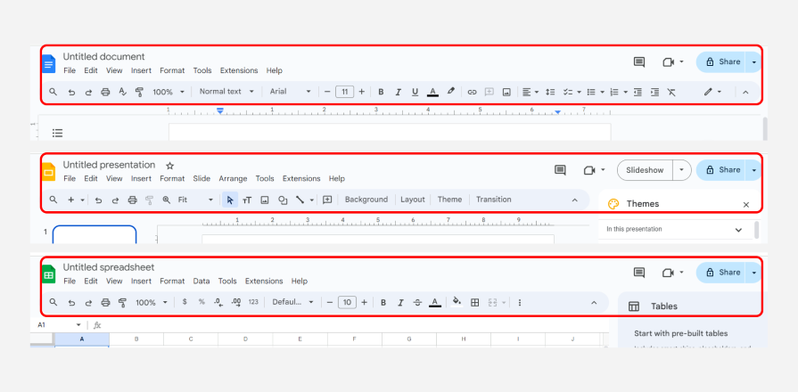 A great example of this principle is the consistent interface across the three Google Workspace tools shown above. Although the toolbars are contextual based on the product, most elements are in the same location across all interfaces.