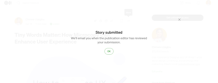For example, this confirmation message from Medium lets a user know that their story has been successfully submitted and what next step to expect.