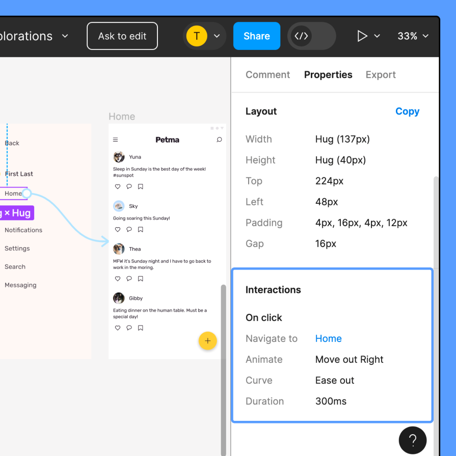 Figma also didn’t require a space to manage a set of screens, like InVision had, because the file is already set up using frames that can be connected into a prototype flow: