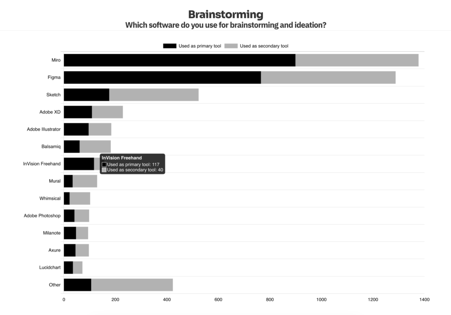 By 2020, the pandemic forced designers to work remotely, which led to a sudden rise in the use of digital whiteboarding and brainstorming tools. This presented an opportunity for InVision to regain some users with Freehand. However, according to UX Tools’ 2020 Design Tools Survey, Freehand was outchosen by its three bigger competitors as designers’ primary tools for brainstorming and ideation: