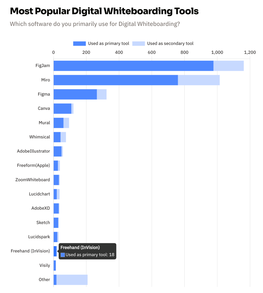 With Miro and Figma both dominating the design collaboration industry, InVision’s future wasn’t looking too good. As of 2023, InVision had less than 1 percent of designers using its tool for digital whiteboarding, according to UX Tools’ 2023 Design Tools Survey: