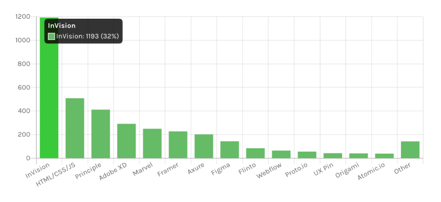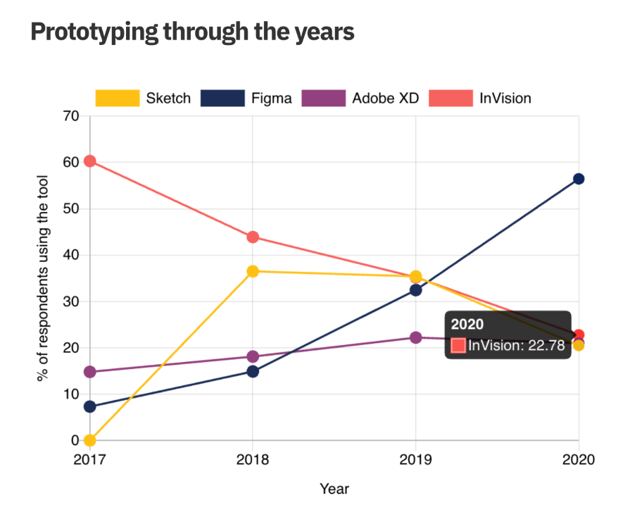 But InVision was still the prototyping tool of choice for designers in 2017. According to UX Tools’ 2017 Design Tools Survey, the company had almost a third of the market share, making them the clear winner at the time. On the other hand, Figma had less than 10 percent of users using its application for prototyping purposes: