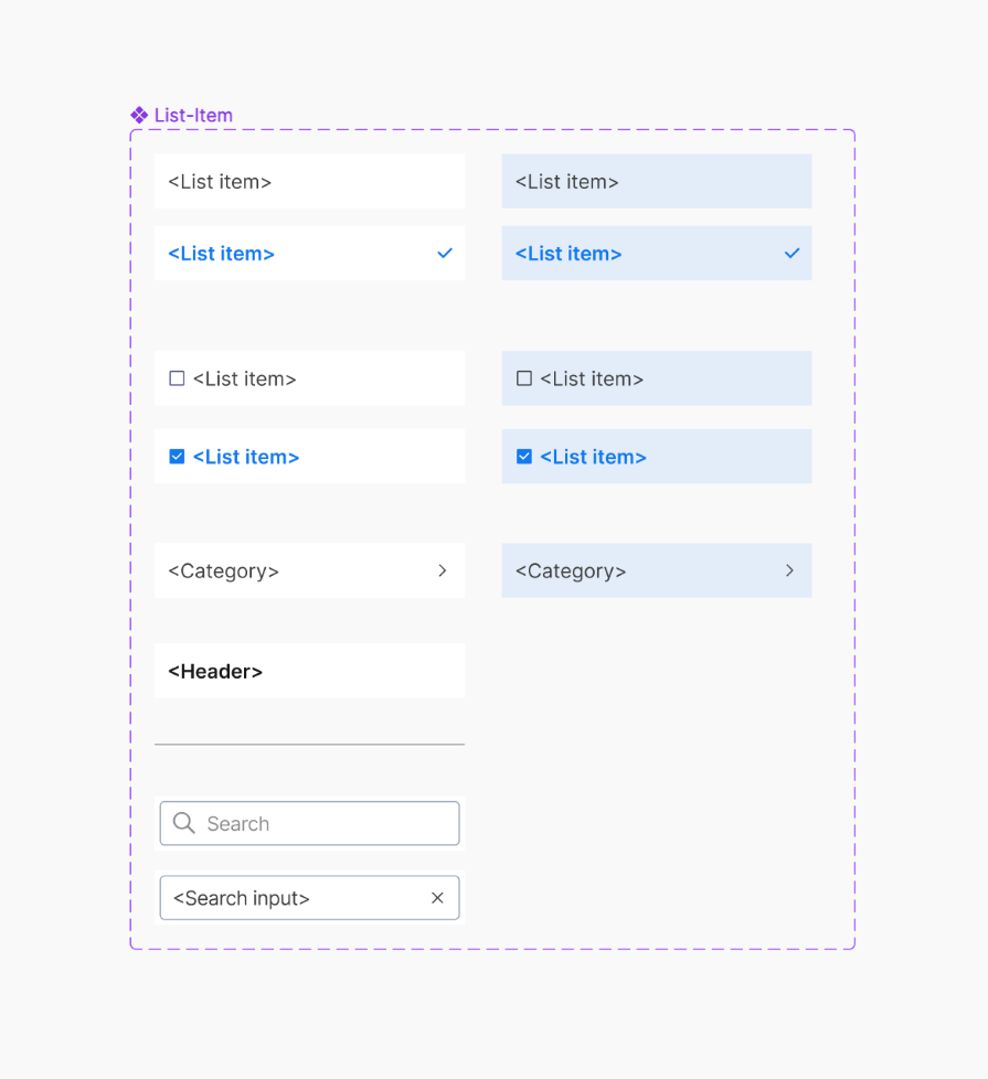 Now that you have your list item variants created, it’s time to put them all together into a list. The order in which you add the list items doesn’t really matter, as they can all be swapped with each other. However, the search bar should always be at the top.