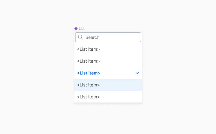 Our dropdown menu list will have a few item variants to accommodate for different use cases. Whether your designs need a simple dropdown, multi-select dropdown, nested dropdown, or search capabilities, we’ll create the necessary list items to make a flexible dropdown menu.