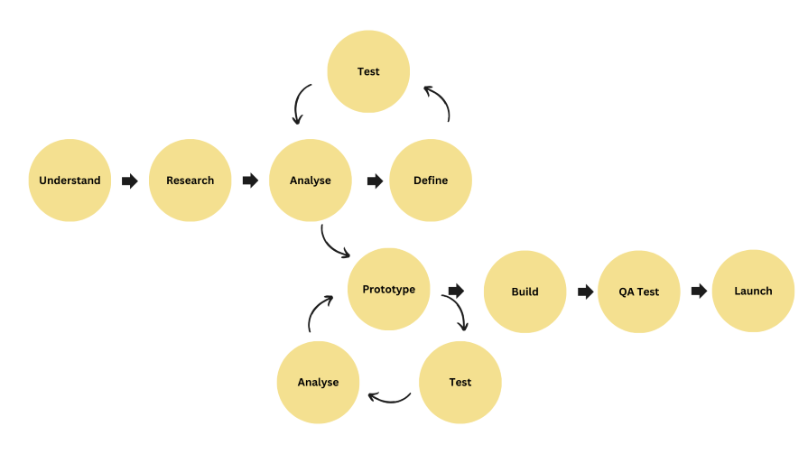 This image depicts the iterative nature of UX projects. It shows how a project could go from analysis to definition, testing, and back to analysis. It could also go from analysis to prototyping, testing, back to analysis and prototyping. This process is fed by insights, which determine what would be the next stage in the process.