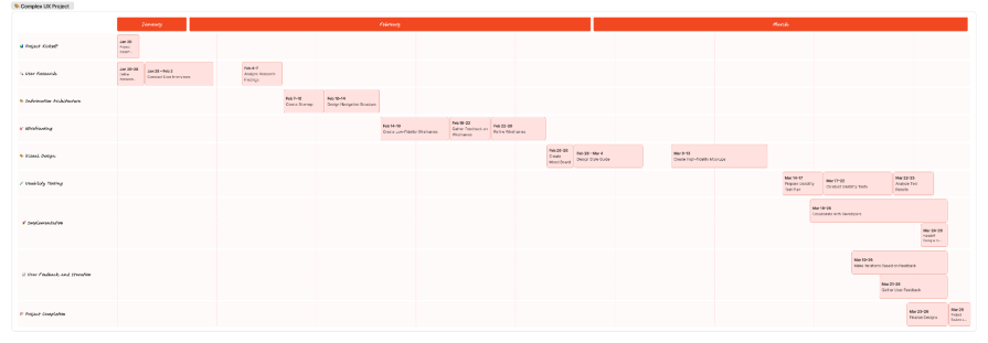 For example, consider a UX project focused on website redesign. Gantt charts may outline a linear sequence of tasks, such as wireframing, prototyping, and testing, with fixed timelines for each phase.