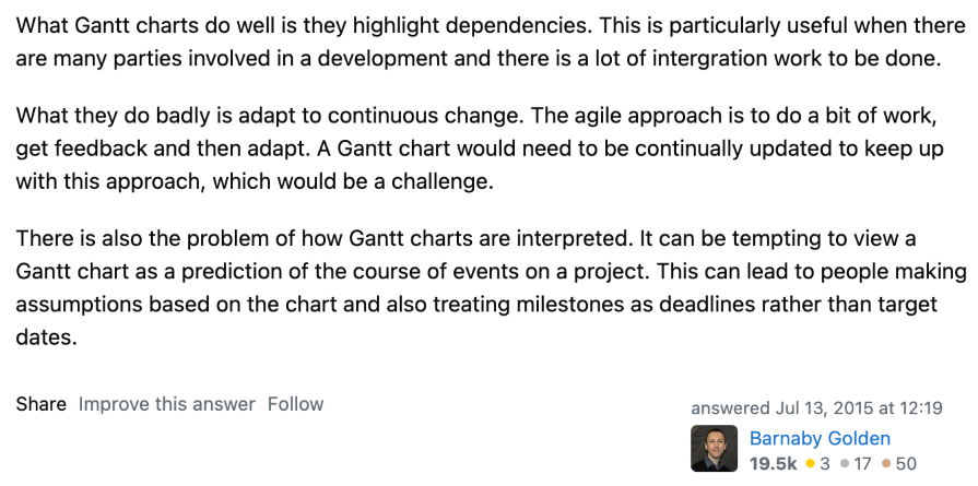 The major setback here is that Gantt charts do badly at adapting to continuous change. Agile coach Bradley Golden is quoted saying that “The agile approach is to do a bit of work, get feedback, and then adapt. A Gantt chart would need to be continually updated to keep up with this approach, which would be a challenge.”