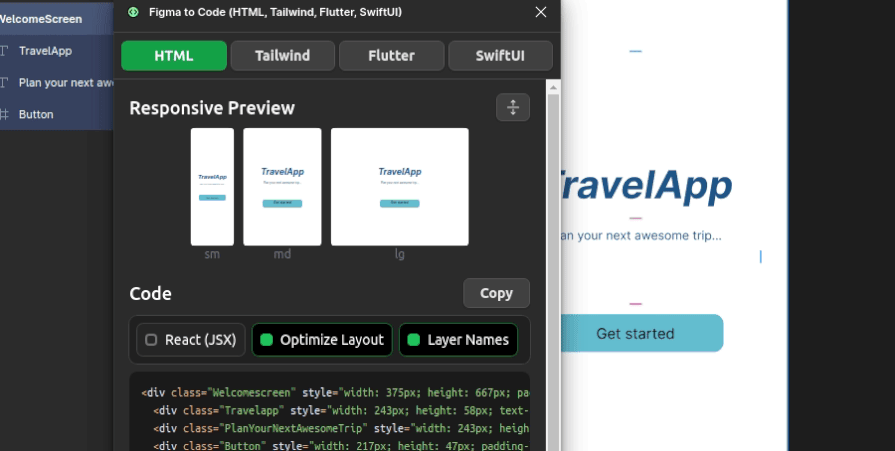 The Figma to Code community plugin can generate code for HTML/CSS, Tailwind, Flutter, and SwiftUI targets. It generates Flutter stateless widget code and widget tree structure when you select a specific Figma UI element. This plugin even lets you create a quick Flutter app by generating the whole content of the lib/main.dart file. Apart from this plugin’s primary code generation feature, it displays a responsive UI preview and color theme preview.