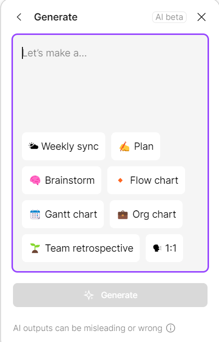 Despite a lot of suggestions by the tool (at least eight just by clicking on the text field), most of them will generate the same kind of artifact. There is a kind of redundancy in the results that can be annoying. A brainstorm, a one-on-one meeting, and a team retrospective are not the same, so why always get the same results?